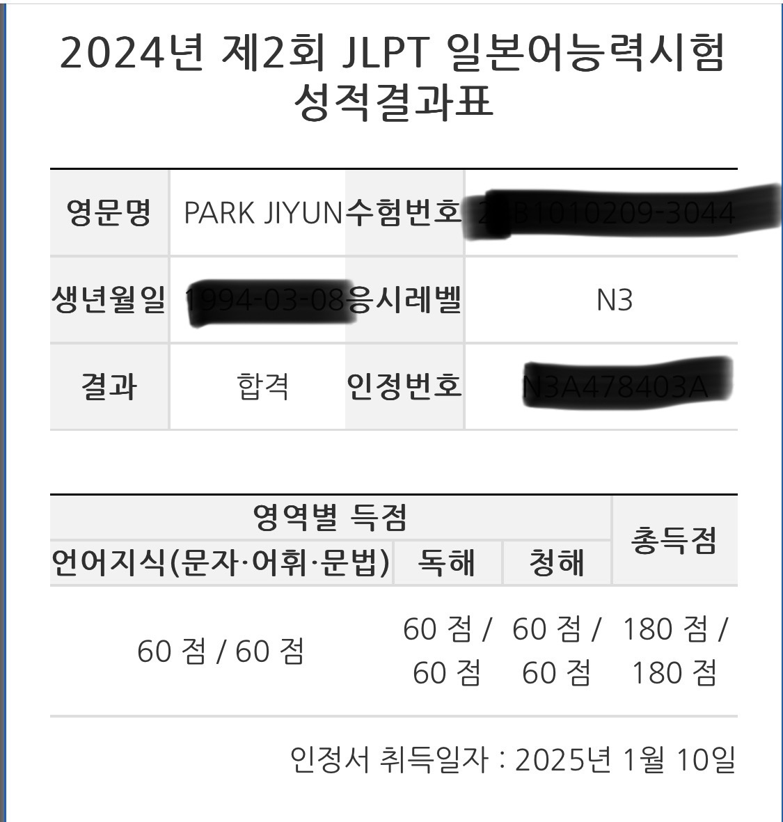 일본으로 여행을 많이 다니던 사람으로서, 일본의 음식과 문화를 좋아하고 애니도 즐겨보는 사람으로서 일본어를 잘 하고 싶다는 욕구를 늘 가져왔습니다. 개인적으로 듣기도 좋고, 문자도 예쁘다고 늘 생각해왔습니다. 하지만 중학교때 배웠던 기초 일본어가 다였어서 히라가나와 기본적인 인사말 정도만 알고 있었고 한자는 물론 단어들도 하나도 알지 못한 상태였습니다. 여유 시간이 많이 생긴 기회로 JLPT를 준비하기 위해 합격 후기들을 찾아보니 해커스 JLPT 환급반 도움을 받은 사람들 후기가 많았고, 저도 믿고 환급반을 결재했습니다. 9월부터 세달간 준비하였고, 해커스 교재의 체계적인 세달 준비 시스템을 그대로 따라 매일 조금씩 한자와 단어들을 외워갔습니다. 한자, 발음, 문법 등 꼼꼼하게 알려주신 최연지 선생님께 감사드린다고 말씀 드리고 싶습니다. 연지쌤이 아니었다면 만점의 쾌거를 이루지 못했을거라 생각합니다. 시험을 치르고 나니 합격 여부와 상관없이 일본어 및 한자가 읽히고, 일본 드라마나 애니의 일본어가 조금씩 들리기 시작했습니다. 너무 만족스러운 JLPT 공부가 되었습니다. 해커스 교재와 함께 매일 꾸준히 조금씩 시간을 투자하는 것이 답이라고 생각됩니다. JLPT 준비하시는 모든 분들 파이팅입니다!