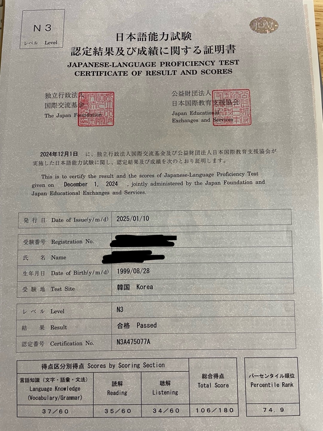 - 2024 12.01 제 2회 JLPT N3 합격후기입니다